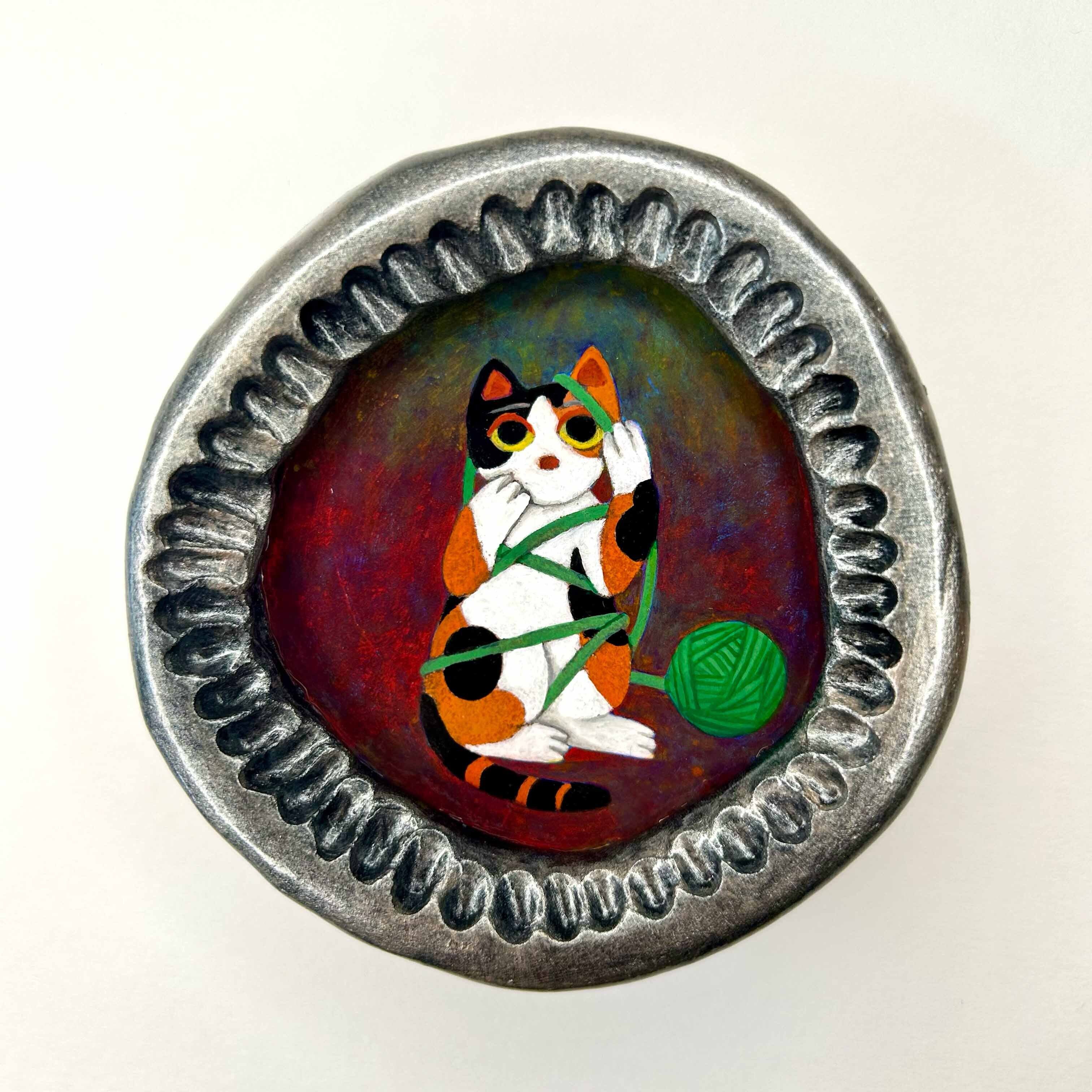 作品サイズ:85x85x23mm 陶芸粘土、アクリル絵具、金具