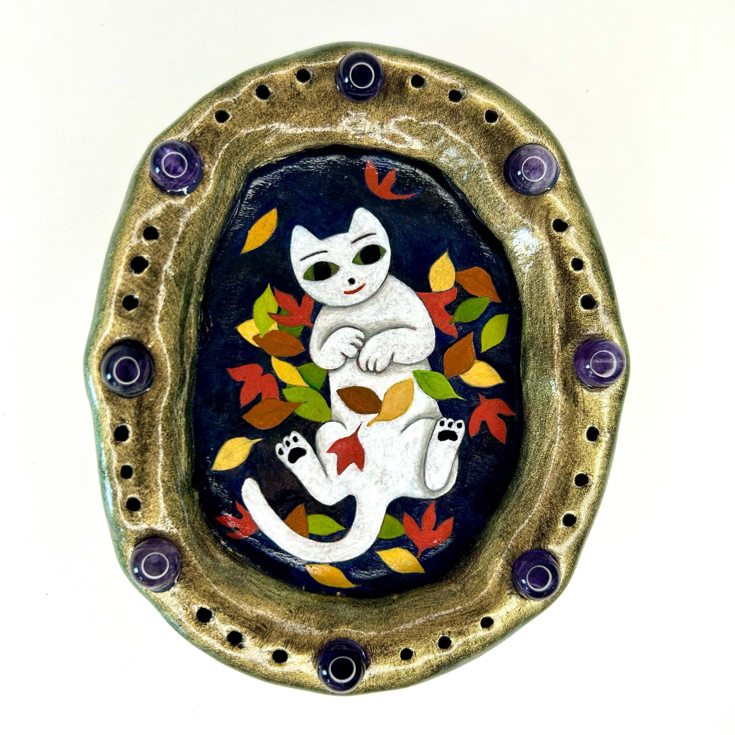 作品サイズ:110x90x28mm 陶芸粘土、アクリル絵具、金具